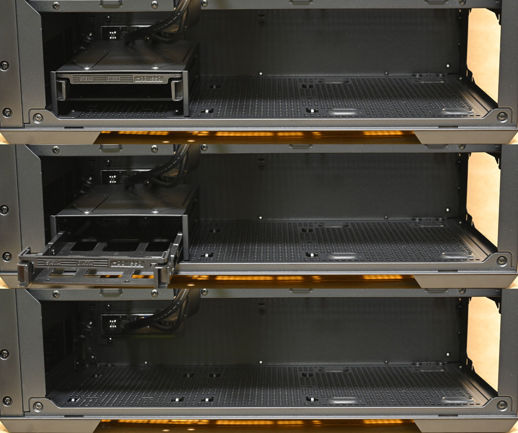 ●底部可拆卸式固定架具備1個抽取式托盤,可安裝2個3.5吋硬碟/2.5吋SSD,未安裝時可獲得最大電源供應器安裝空間
