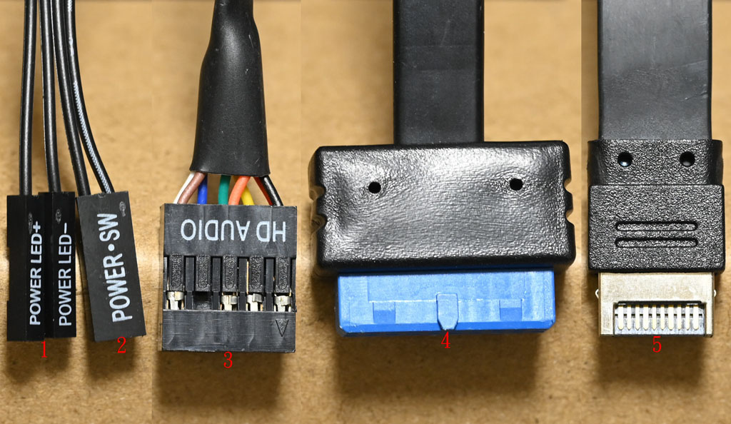 ▼機殼連接線組,1為電源指示燈接頭,2為電源開關接頭,3為耳機麥克風插座接頭,4為USB3.2 Type-A 19pin接頭,5為USB3.2 Type-C 20pin接頭