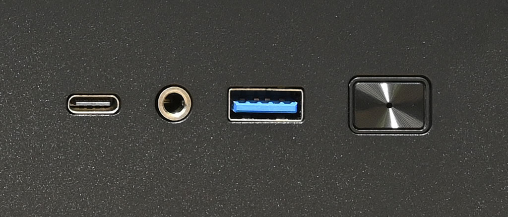 ▼位於機殼左側右下方的橫置式I/O埠、按鈕與指示燈,由左至右分別是1個USB3.2 Type-C、4極耳機麥克風3.5mm插座、1個USB3.2 Type-A、長方形電源按鈕/電源指示燈(中央圓孔)。未配置硬碟指示燈及重置按鈕