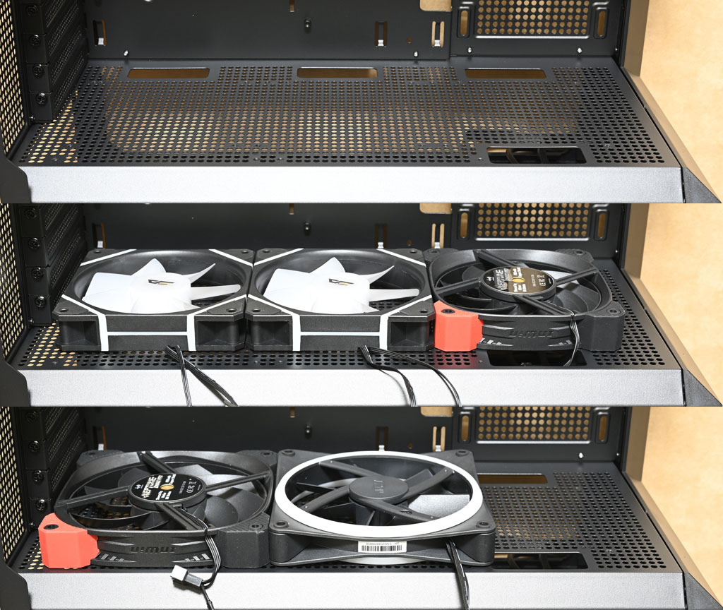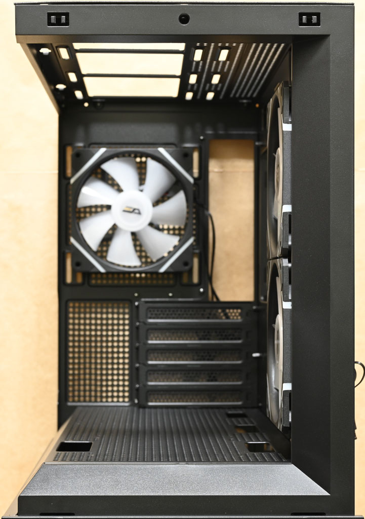 ●右側前方/頂部/電源艙頂部/後方均有安裝風扇的位置,提供最多9個120mm風扇安裝空間。右側前方預裝2個反向ARGB發光120mm風扇,後方預裝1個ARGB發光120mm風扇,風扇線路使用方便串接的設計
