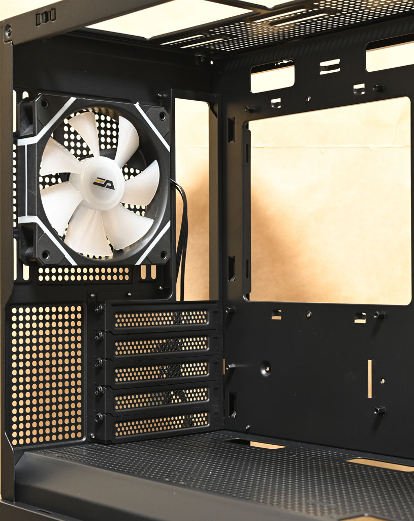 ▼後方預裝1個ARGB發光120mm風扇,主機板安裝底板上方鏤空,方便拆裝CPU散熱器背板。5個標準擴充槽均採用可重複使用的通風擋板