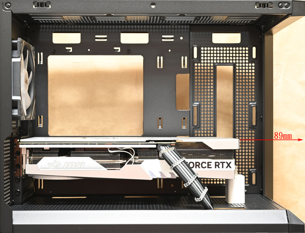 ▼安裝MSI GEFORCE RTX 4070Ti GAMING X TRIO WHITE(337×140×62mm),顯示卡前端與機殼前方面板距離89mm