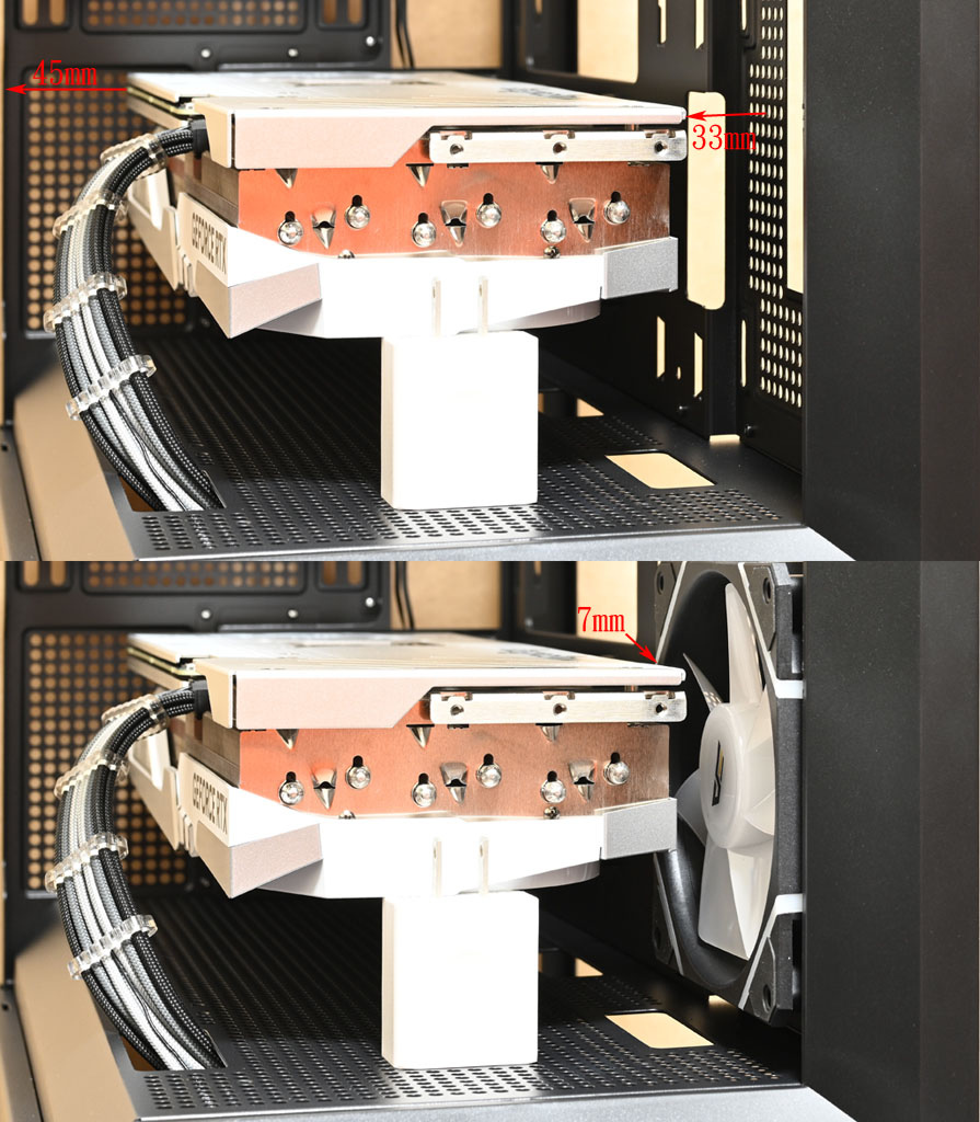 ▼安裝MSI GEFORCE RTX 4070Ti GAMING X TRIO WHITE(337×140×62mm),顯示卡左側與機殼左側面板距離45mm,顯示卡右側與機殼右側前方風扇安裝位置距離33mm(無風扇)/7mm(預裝反向ARGB發光120mm風扇)
