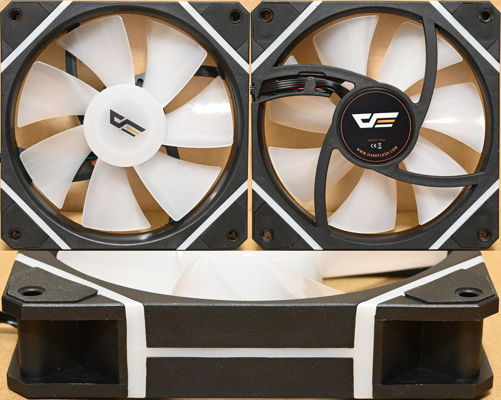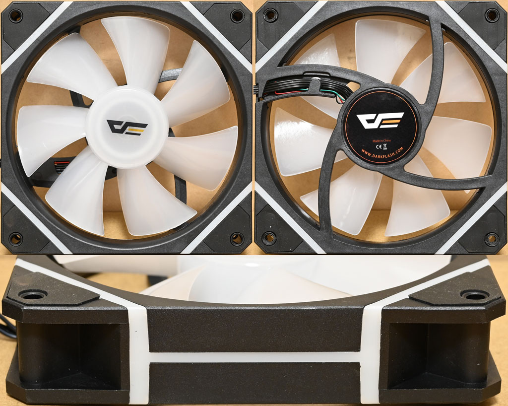 ▼反向ARGB發光120mm風扇,乳白色發光扇葉軸心處有商標,黑色外框中央貼紙有商標、產地、原廠網址,外框兩面及側邊的條狀乳白色區域也會發光,鎖點處有減震墊