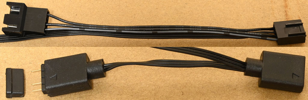 ▼4pin風扇電源線路採用方便串接的公頭+母頭設計,3pin ARGB LED控制線路同樣具備串接用公頭及母頭,公頭有保護蓋