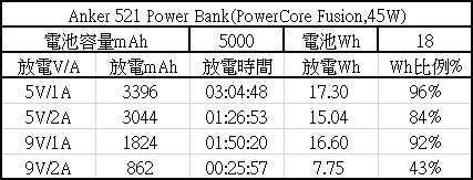 ▼行動電源模式各組放電V/A的放電mAh、放電時間、放電Wh、Wh比例百分比, 5V/1A及5V/2A均超過規格標示的額定電容量,5V/1A可用Wh比例達96%,不過9V/2A放電時,電池電量尚未全部放完就自動關機,導致可用Wh比例僅有43%