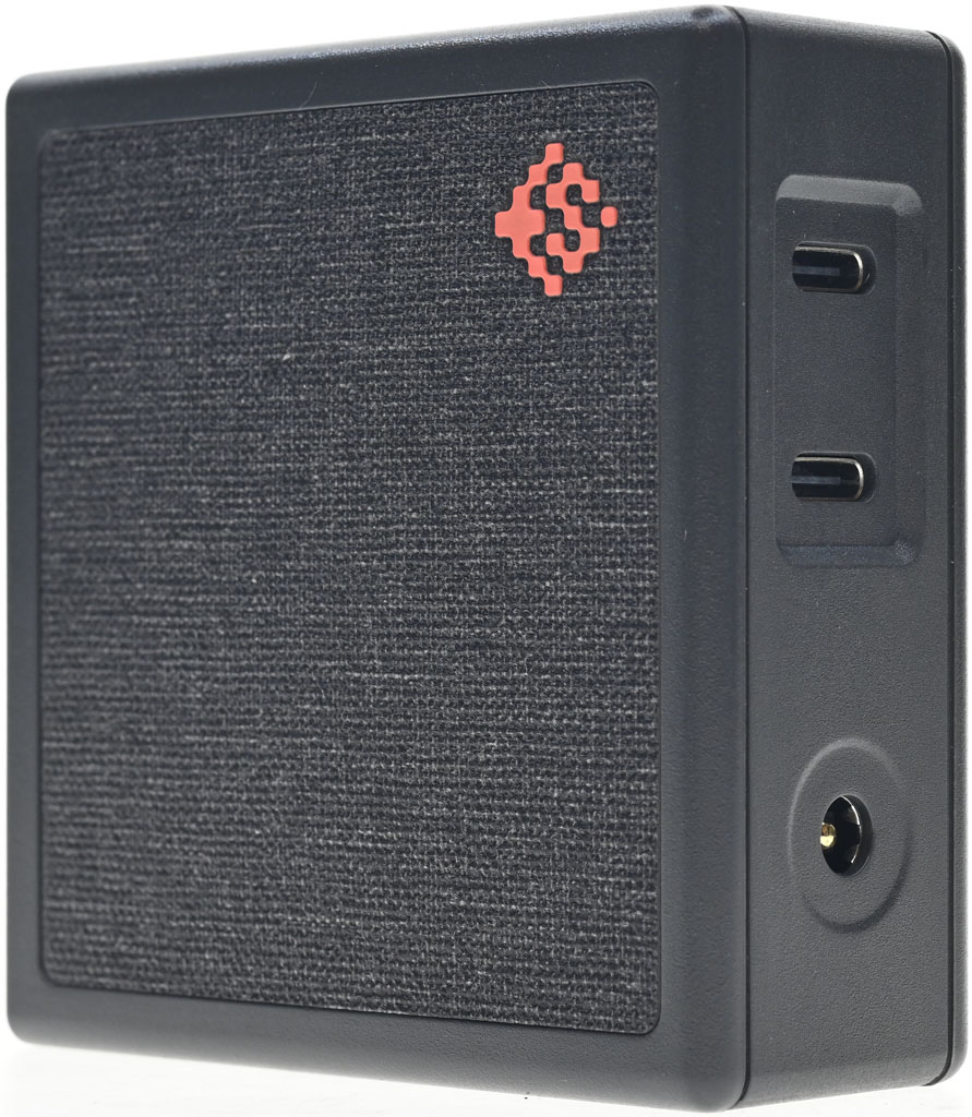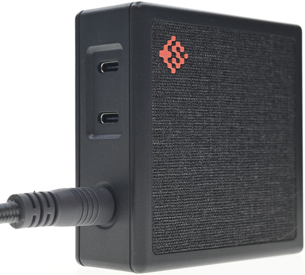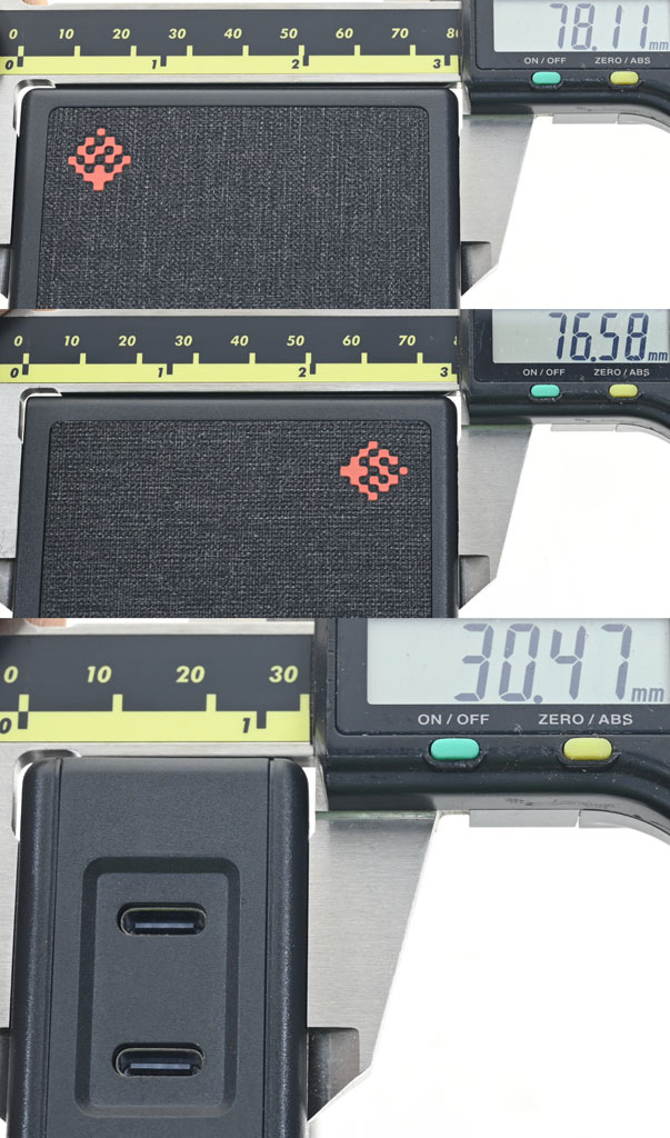 ▼充電器頂部有2個USB-C輸出埠及1個DC插座,底部印上商標、SlimQ字樣、GaNFast標誌、產品名稱、型號、輸入/輸出規格、支援協議、QR碼、產地(中國)、認證標誌