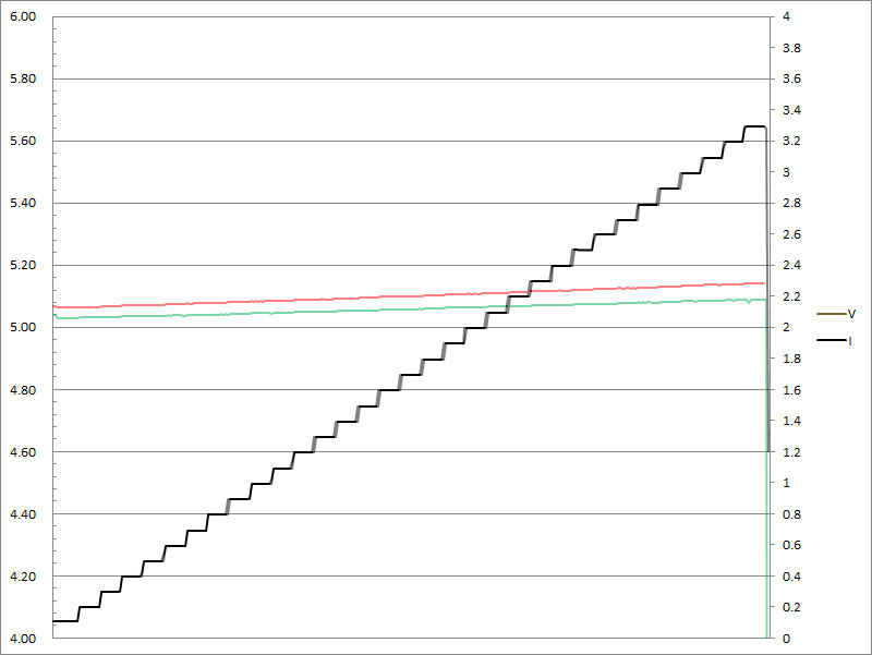 ▼USB-C1(紅)/USB-C2(綠)搭配5A線材的固定檔5V輸出負載測試,隨著電流增加,輸出電壓上升,輸出電流超過3.3A截止