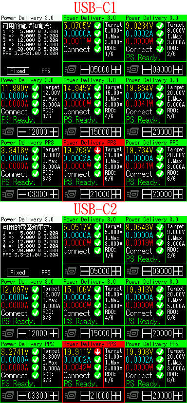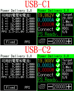 ▼USB-C1/USB-C2單獨使用並搭配5A線材,固定檔提供5V/3A、9V/3A、12V/3A、15V/3A、20V/5A,PPS檔雖然表列3.3V-21V/3A,不過最高輸出電壓只能升到19.7V(C1)/19.9V(C2)左右