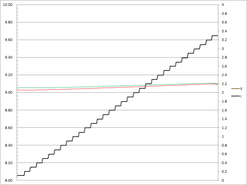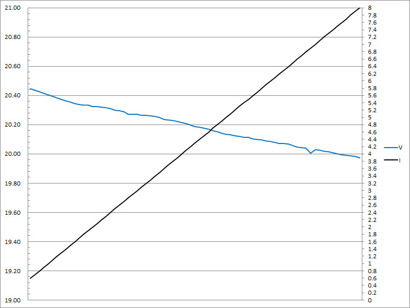 ▼DC插座輸出負載測試,隨著電流增加,輸出電壓下降,輸出電流超過9.6A截止(圖表只測試到8A)