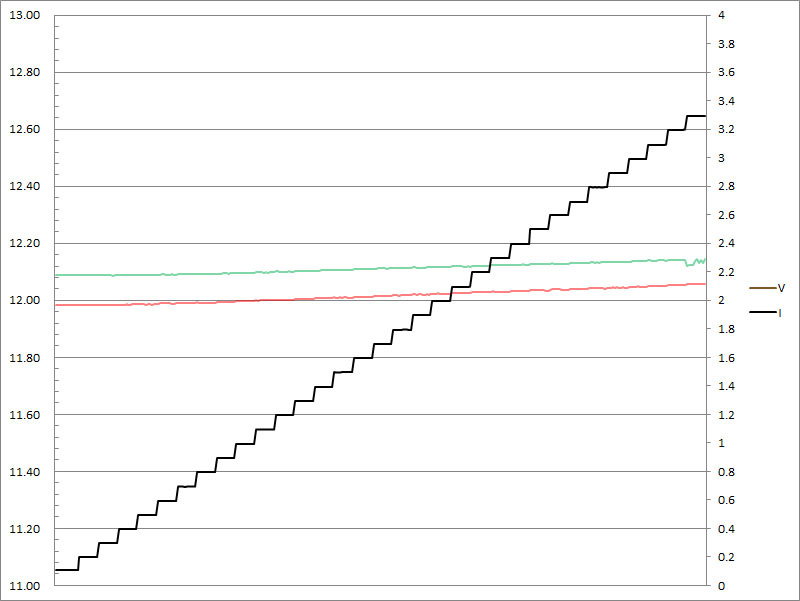 ▼USB-C1(紅)/USB-C2(綠)搭配5A線材的固定檔12V輸出負載測試,隨著電流增加,輸出電壓上升,輸出電流超過3.3A截止