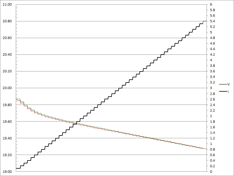 ▼USB-C1(紅)/USB-C2(綠)搭配5A線材的PPS檔20V輸出負載測試,隨著電流增加,輸出電壓下降,輸出電流超過3.3A截止