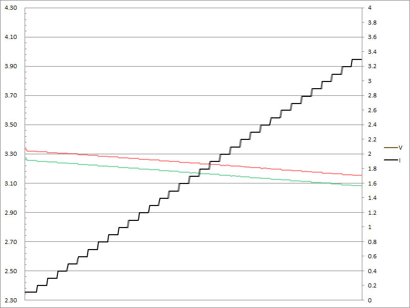 ▼USB-C1(紅)/USB-C2(綠)搭配5A線材的PPS檔3.3V輸出負載測試,隨著電流增加,輸出電壓下降,輸出電流超過3.3A截止