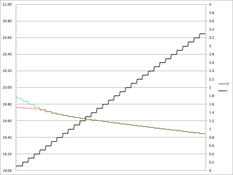 ▼USB-C1(紅)/USB-C2(綠)搭配3A線材的固定檔20V輸出負載測試,隨著電流增加,輸出電壓下降,輸出電流超過3.3A截止