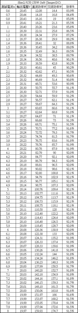 ▼DC插座單獨使用下0.6A至8A輸出轉換效率表,整體輸出轉換效率在83.9%至92.1%之間
