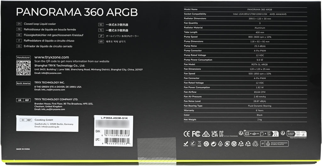 ▼外盒背面有名稱、多國語言"一體式水冷散熱器"、產品更多資訊QR碼連結、廠商聯絡資訊、條碼、產地(中國)、規格表、認證標誌