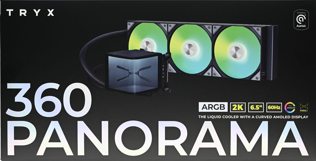 ▼外盒正面有商標、Cooled by Asetek圖示、外觀圖、名稱、ARGB圖示、2K圖示、6.5吋圖示、60Hz圖示、TRYX AMOLED圖示、KANALI圖示