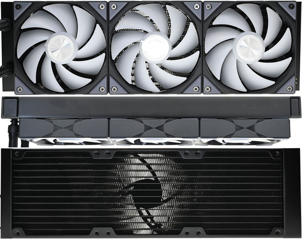 ●Asetek第8代V2高性能水冷方案,鋁製厚度30mm高密度鰭片360mm水冷排,三相馬達水泵支援PWM 4pin調速。水冷頭內建60mm VRM散熱風扇,可在KANALI軟體內控制轉速