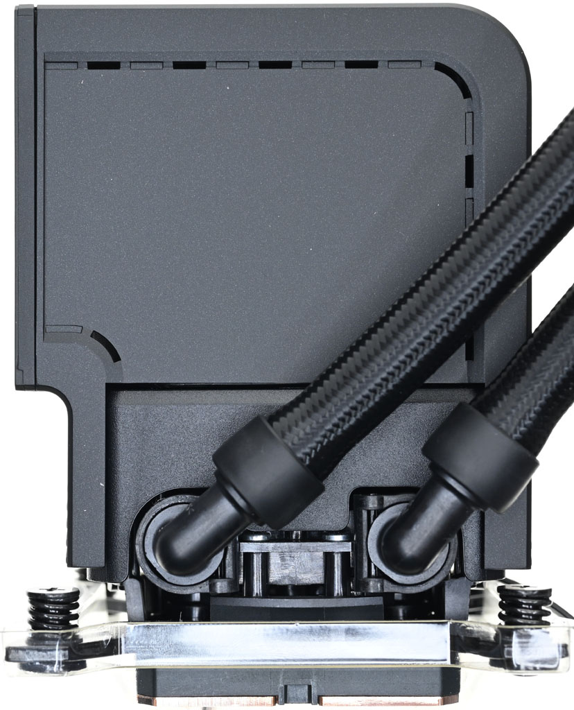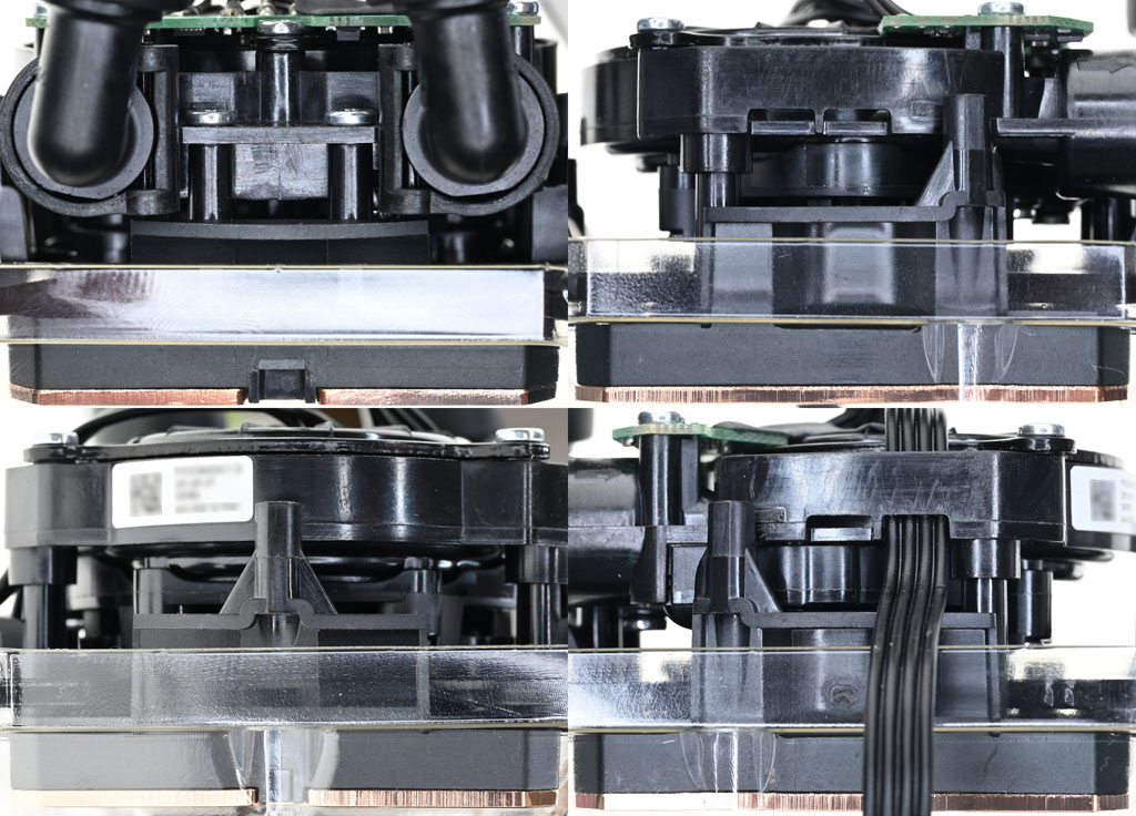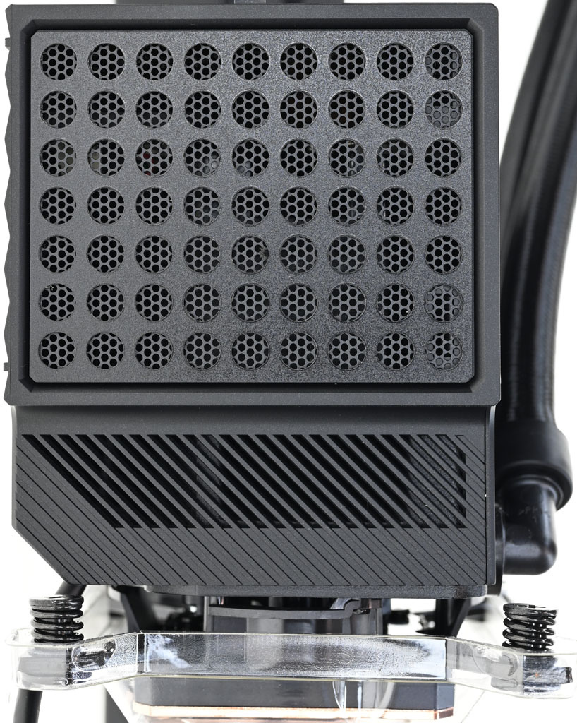 ▼水冷頭處理器接觸面有一個透明保護蓋,用來保護預塗的散熱膏,其中兩個側面有VRM散熱風扇出風口