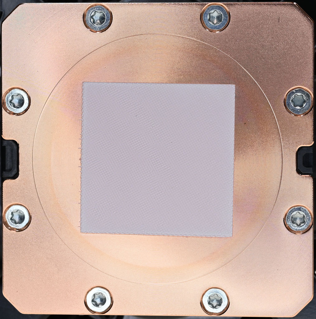 ▼水冷頭處理器接觸面尺寸55.5×55.5mm,使用星型沉頭螺絲固定,並預塗散熱膏