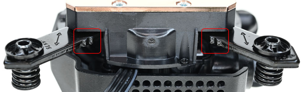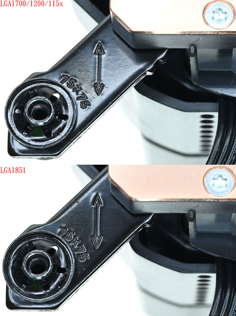 ▼水冷頭托架彈簧螺帽有2段位置,分別對應LGA1851/1700(左)及LGA1200/115x(右)