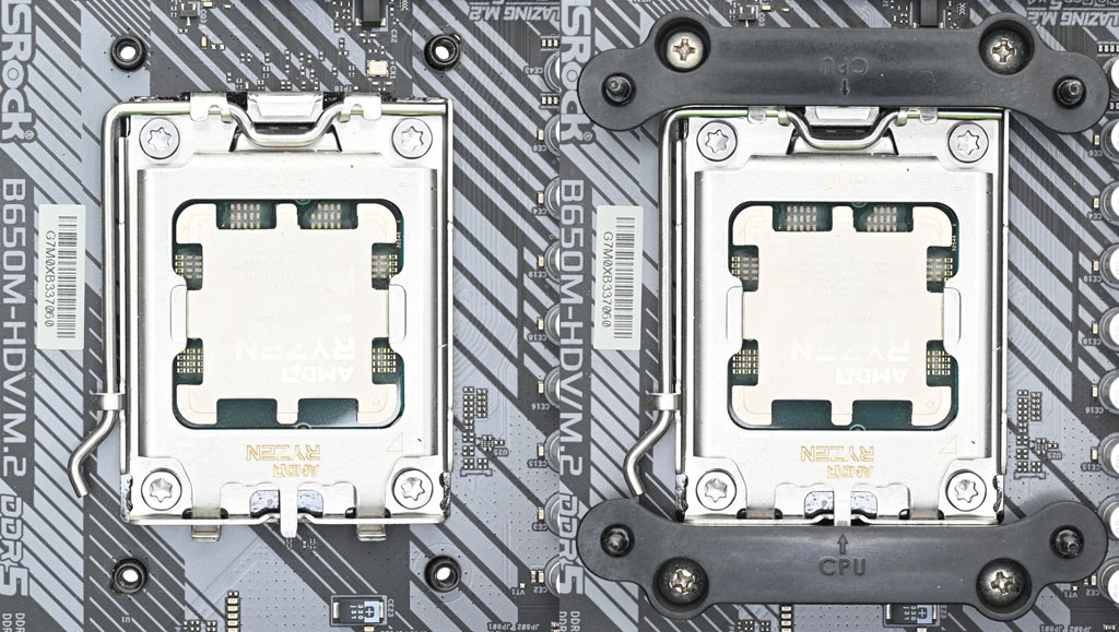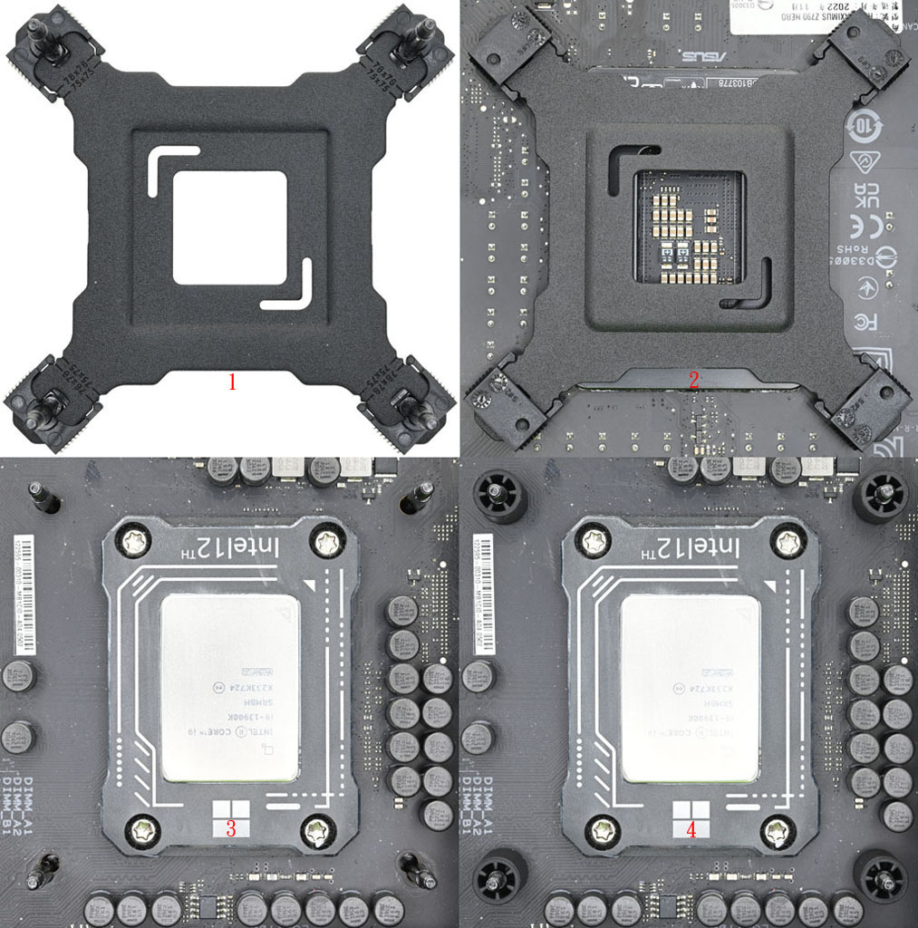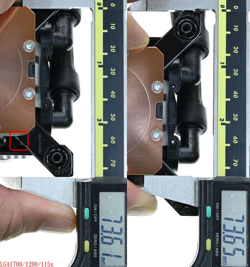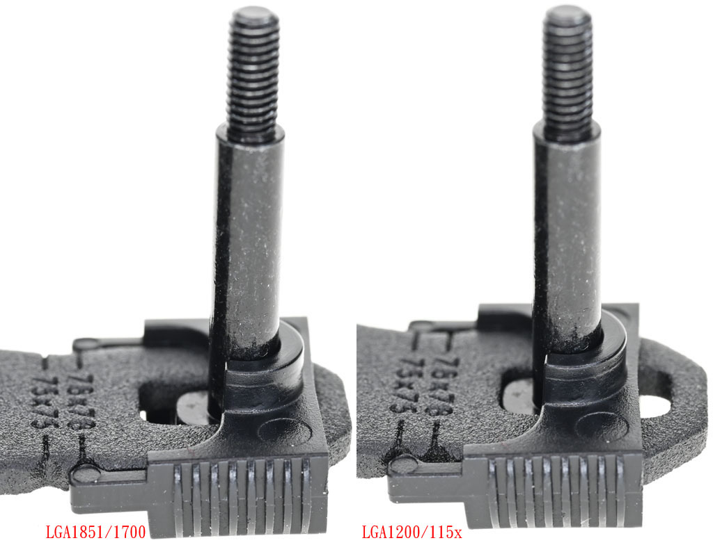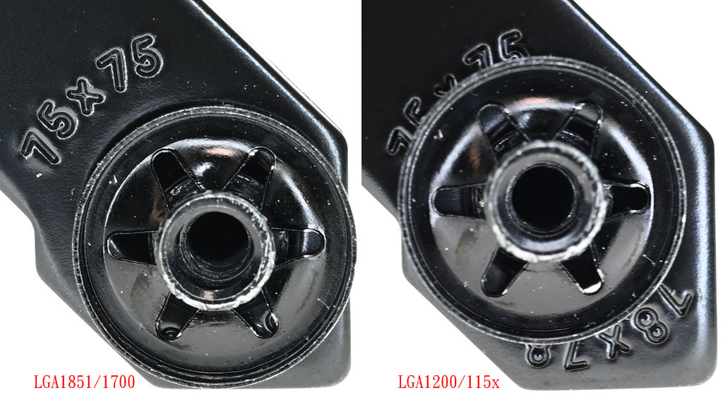 ▼INTEL背板四個角的固定螺柱滑套有2段位置,分別對應LGA1851/1700(左)及LGA1200/115x(右)