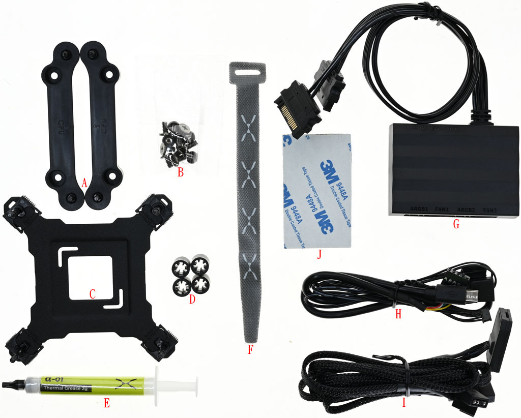 ▼安裝配件有AMD托架轉接座(A)、冷排固定用短螺絲(B)、INTEL背板(C)、INTEL套管(D)、α-01散熱膏(E)、魔鬼氈束帶(F)、ROTA控制盒(G)、ROTA控制盒線組(H)、風扇線組(I)、ROTA控制盒磁吸板(J)