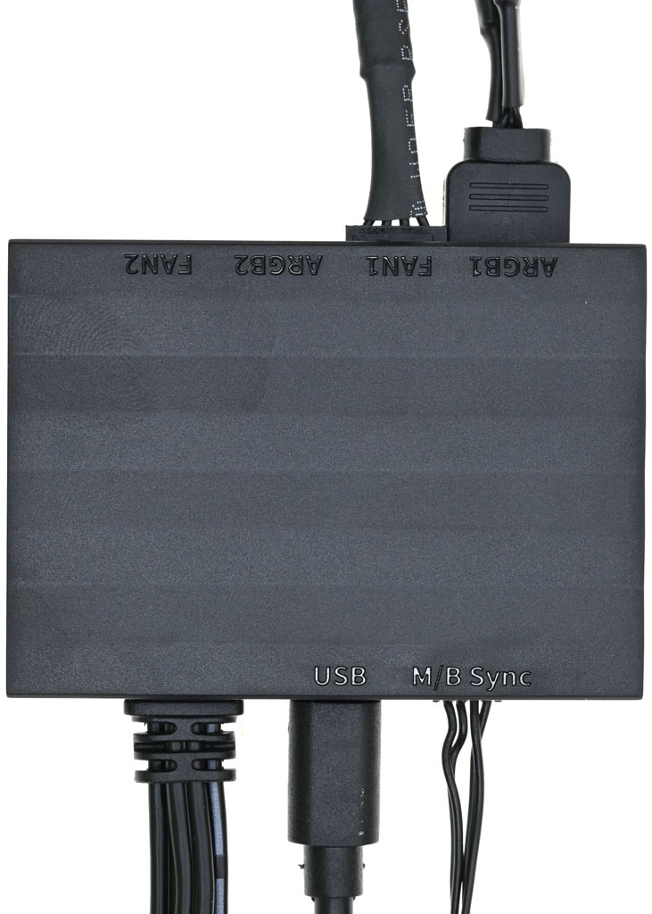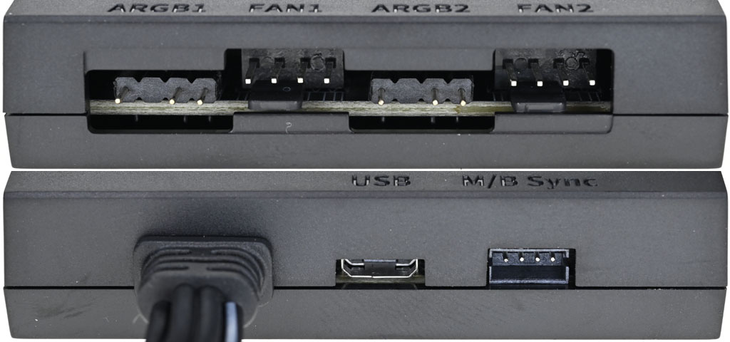▼ROTA控制盒其中一個長邊側面有2組PWM 4pin及ARGB 3pin插針,另一個長邊側面有Micro USB埠及主機板同步用4pin連接器
