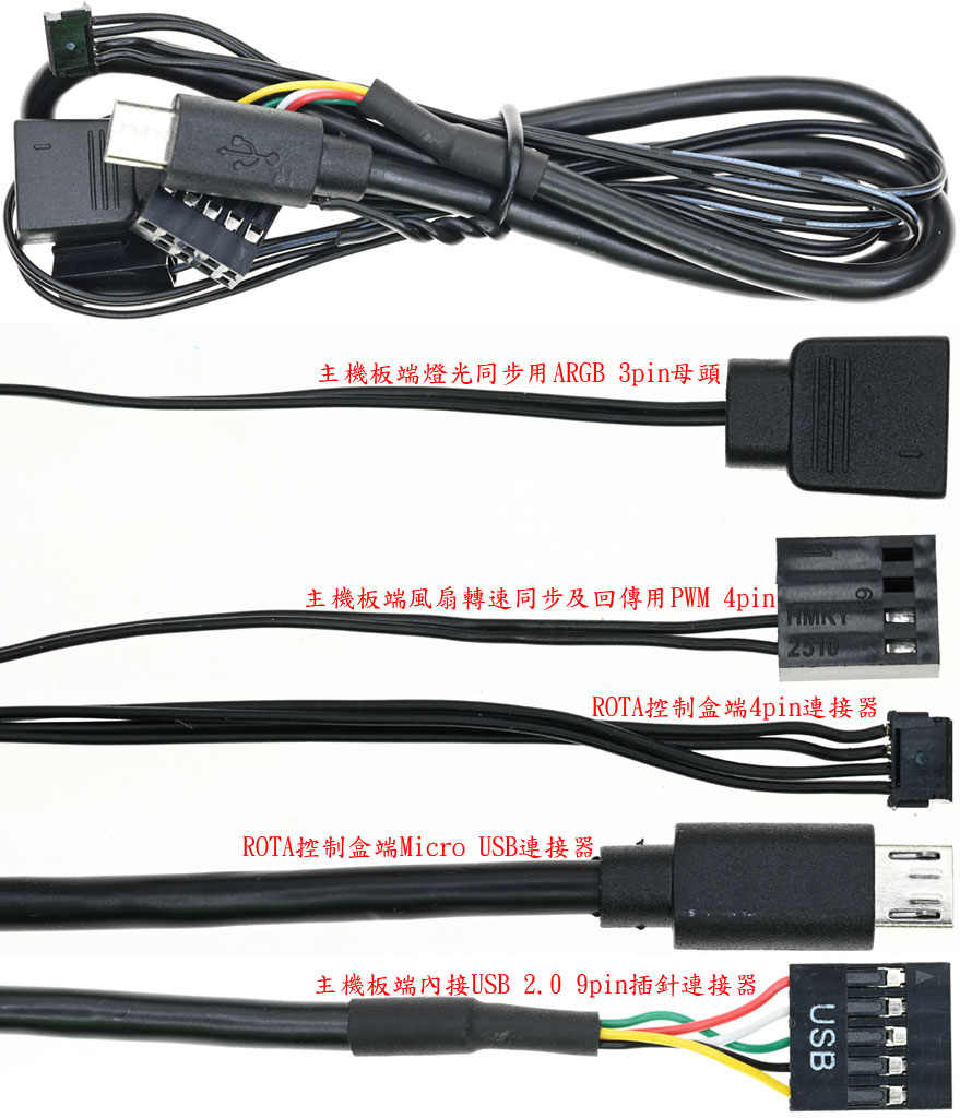 ▼ROTA控制盒線組,主機板同步線一端有燈光同步用ARGB 3pin母頭、風扇轉速同步及回傳用PWM 4pin連接器,另一端接至ROTA控制盒4pin連接器,線路長度39.5公分;Micro USB線一端接至ROTA控制盒Micro USB埠,另一端接至主機板內接USB 2.0 9pin插針,線路長度38.5公分,Micro USB接頭大小21×10×6.7mm