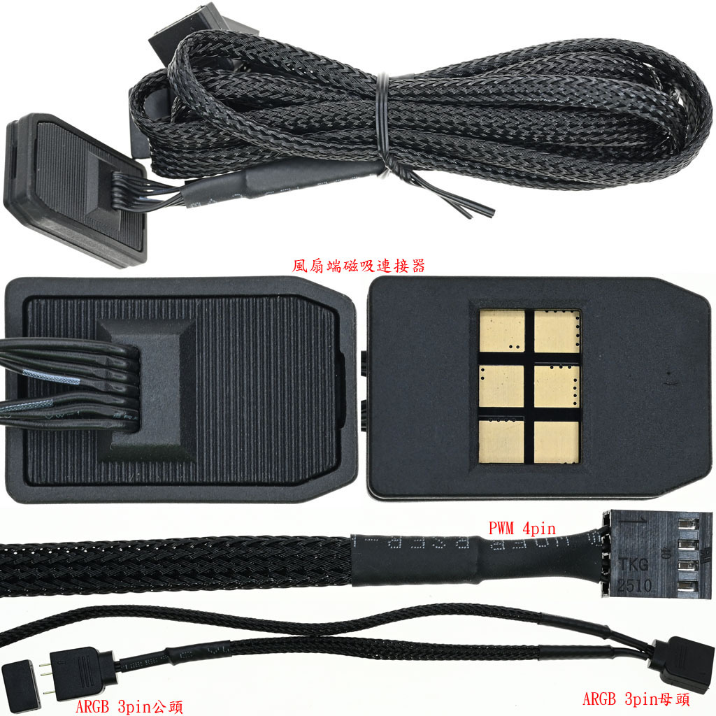 ▼包覆編織網的風扇線組,風扇端磁吸連接器大小31.3×20.2×7.5mm,PWM 4pin線路長度60公分,ARGB 3pin線路至母頭長度60公分,母頭至公頭線路長度14.5公分,公頭有保護蓋