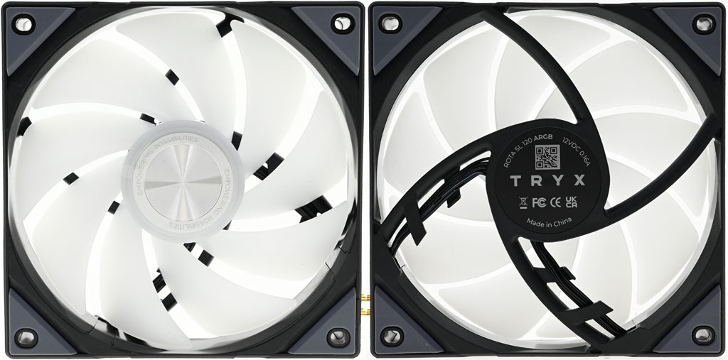 ▼ROTA SL ARGB發光風扇,使用FDB軸承,風扇外框兩面橢圓螺絲孔皆有防震墊,9葉片乳白色扇葉軸心有銀色裝飾銘牌,外框中心標籤上有名稱、風扇電壓/電流、QR碼、商標、認證標誌、產地(中國)