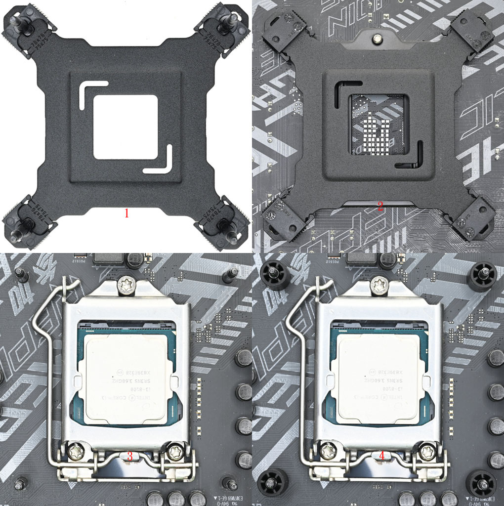 ▼安裝於INTEL LGA1200/115x平台時,將INTEL背板調整成適用LGA1200/115x平台配置(1),把INTEL背板固定螺柱對準主機板背面散熱器孔位放入(2),背板正確安裝後主機板正面散熱器孔位會露出4支高度相同的固定螺柱(3),將4個INTEL套管套入固定螺柱(4)