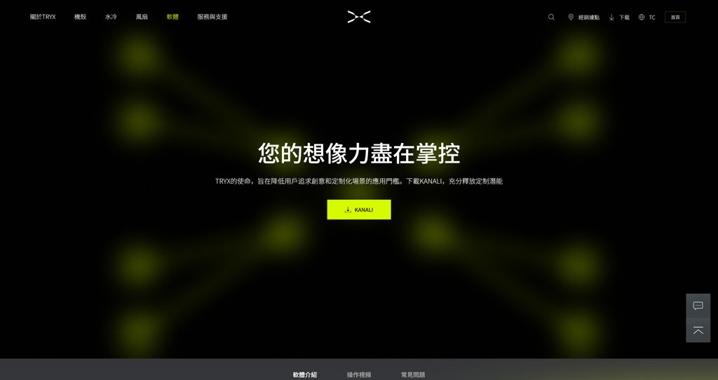 ▼接上電源及開機前務必先接好水冷頭的PWM 4pin及USB 2.0 9pin,ROTA控制盒的主機板同步線、USB 2.0 9pin、SATA電源連接器,水冷排風扇的PWM 4pin及ARGB 3pin。開機後水冷頭螢幕會先顯示商標3D影片,然後循環播放TRYX文字3D迷宮影片,等待KANALI軟體連接