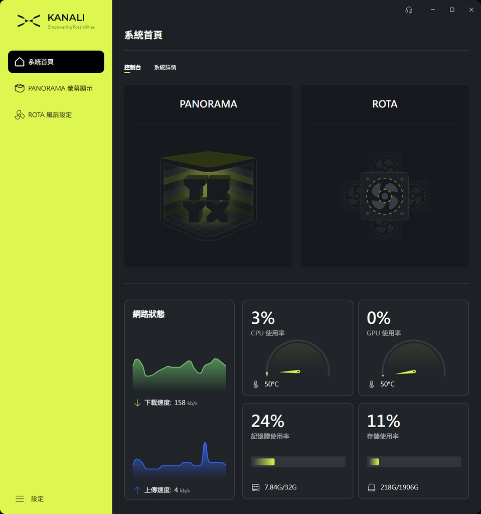 ▼安裝完成並啟動KANALI軟體,進入軟體畫面後最左邊綠色欄位顯示商標/標語、系統首頁、PANORAMA螢幕顯示、ROTA風扇設定、設定。系統首頁的控制台分頁顯示已連接PANORAMA、已連接ROTA、網路狀態、CPU使用率、GPU使用率、記憶體使用率、存儲使用率