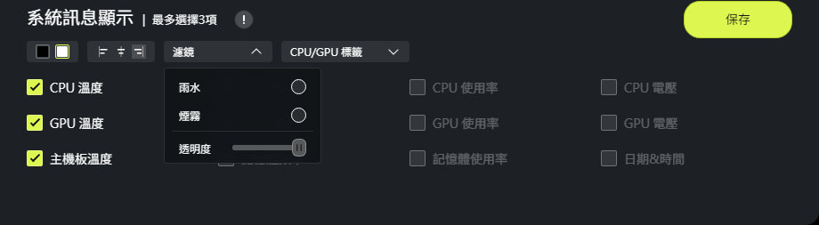 ▼PANORAMA螢幕顯示的預設分頁下方有系統訊息顯示設定,可選CPU溫度、CPU頻率、CPU使用率、CPU電壓、GPU溫度、GPU頻率、GPU使用率、GPU電壓、主機板溫度、記憶體頻率、記憶體使用率、日期&時間,最多可選擇三項,並可選擇文字顏色(黑/白)、文字位置、濾鏡及透明度(雨水/煙霧)、CPU/GPU標籤開啟/關閉
