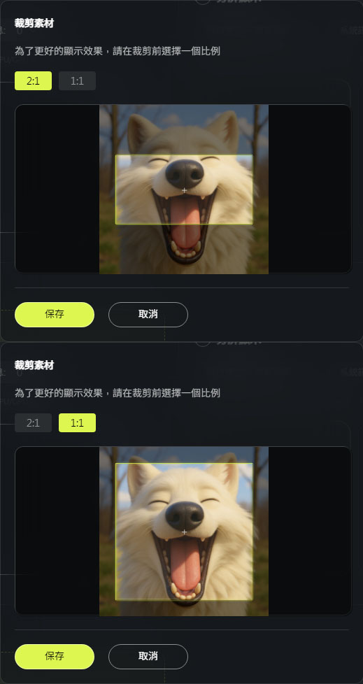 ▼素材庫上傳圖片/影片素材,選擇檔案後會出現裁剪素材視窗,選擇2:1(適用全屏顯示)或1:1(適用分屏顯示),會出現對應比例的綠色裁切框,可調整裁切框位置及大小