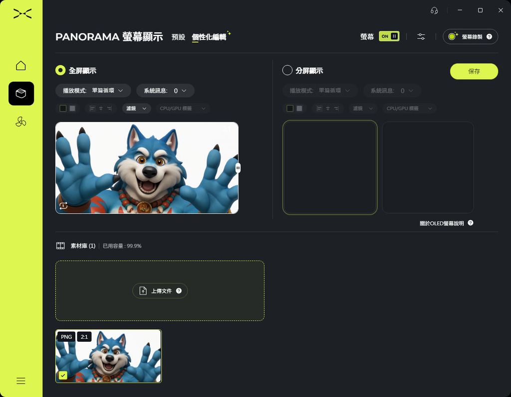 ▼PANORAMA螢幕顯示的個性化編輯分頁,可選擇全屏顯示、分屏顯示。最下方素材庫可上傳圖片/影片素材,並顯示已用容量百分比。分屏顯示下方有關於OLED使用說明,提醒使用者不要長時間顯示固定畫面,應定期切換