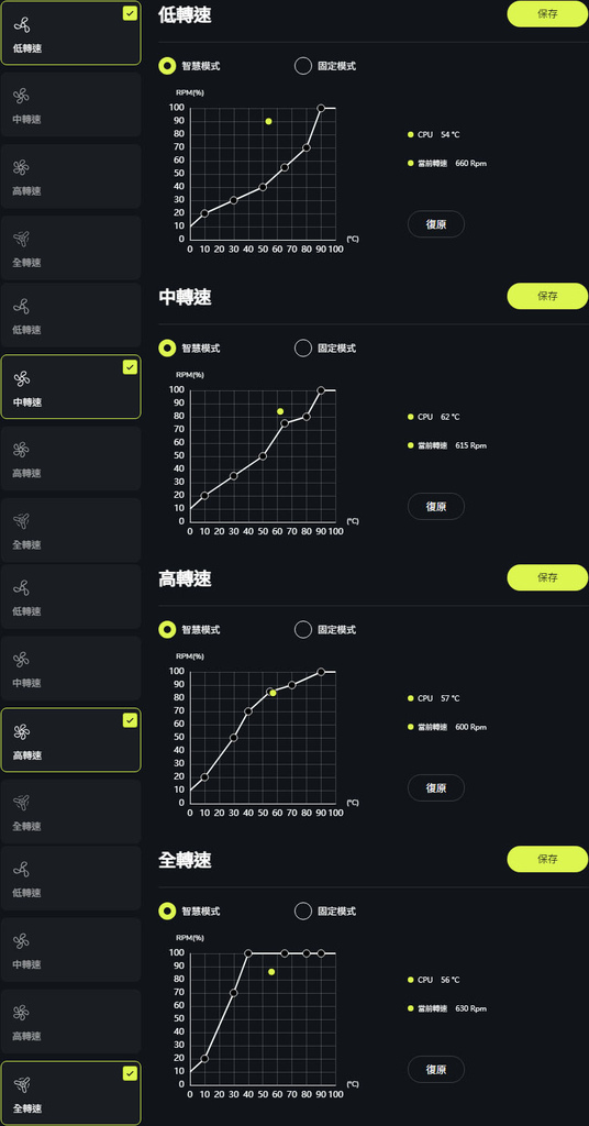 ▼ROTA風扇設定,提供低轉速/中轉速/高轉速/全轉速4組風扇曲線,每組曲線可選擇智慧模式或固定模式。曲線右側顯示目前CPU溫度、水冷排風扇轉速