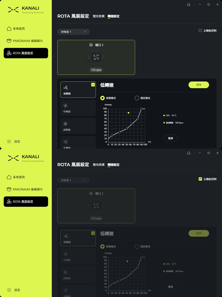 ▼ROTA風扇設定的轉速設定分頁,左上可選擇ROTA控制盒編號及通道編號,勾選主機板控制時會同步主機板風扇轉速控制