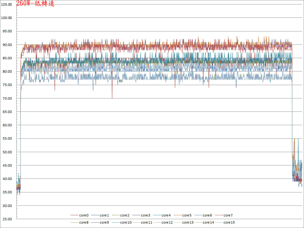 ▼風扇模式設定低轉速,功耗限制260W下高負載30分鐘CORE TEMP溫度記錄圖