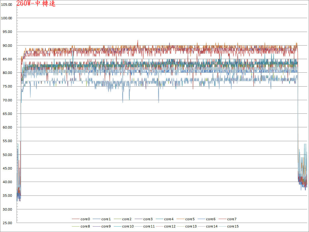 ▼風扇模式設定中轉速,功耗限制260W下高負載30分鐘CORE TEMP溫度記錄圖