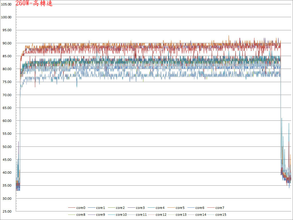 ▼風扇模式設定高轉速,功耗限制260W下高負載30分鐘CORE TEMP溫度記錄圖