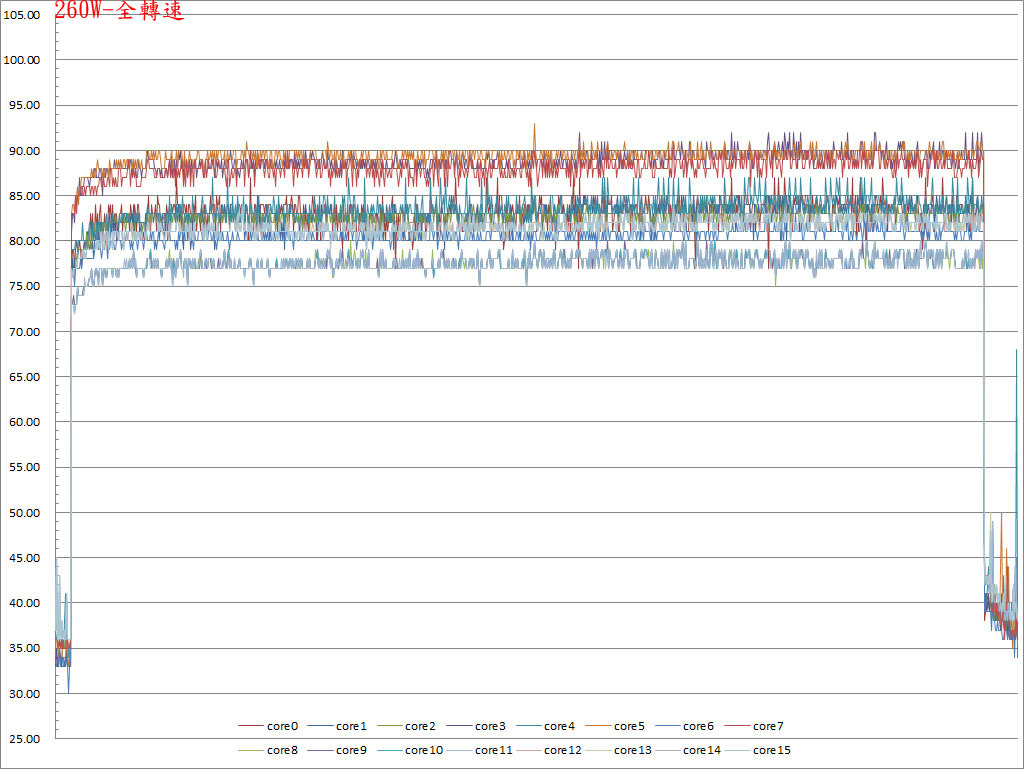 ▼風扇模式設定全轉速,功耗限制260W下高負載30分鐘CORE TEMP溫度記錄圖