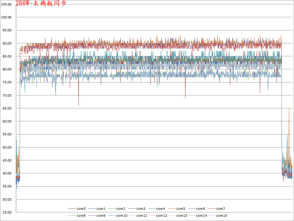 ▼風扇模式設定主機板同步,功耗限制260W下高負載30分鐘CORE TEMP溫度記錄圖