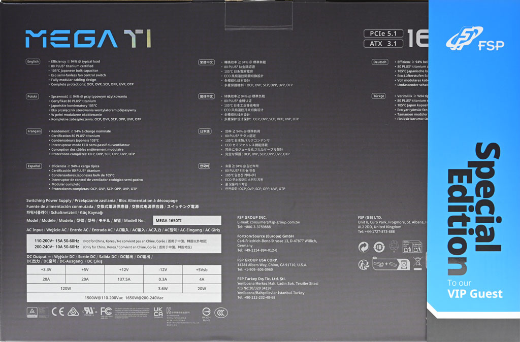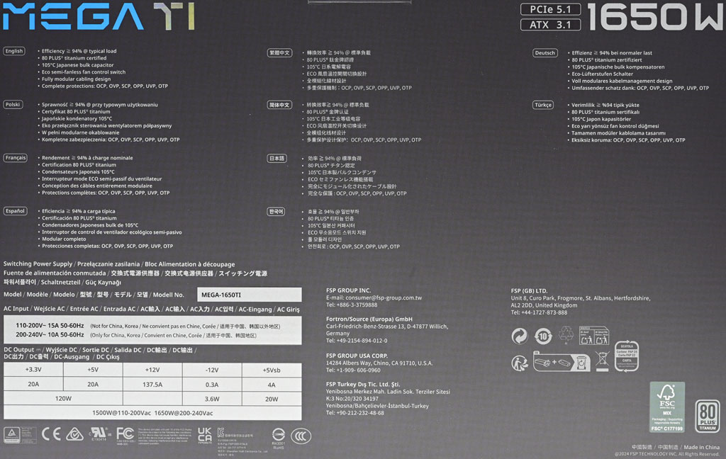 ▼外盒背面有產品名稱、PCIe 5.1標示、ATX 3.1標示、輸出功率、多國語言產品特色、輸入/輸出規格表(輸入電壓/電流/頻率、各組最大輸出電流/功率、總輸出功率)、安規認證、廠商聯絡資訊、回收資訊、FSC認證、80PLUS鈦金認證