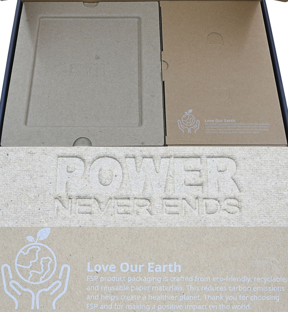 ▼打開外盒,電源裝在左邊由回收紙漿所製成的防震包材內,包材上有POWER NEVER ENDS標語。右邊裝配件的紙盒上面標示此包材使用可回收再利用紙材製成,降低碳排放