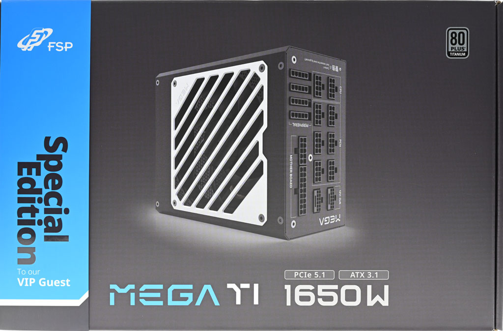 ▼外盒正面有商標、80PLUS鈦金認證、外觀圖、日系Bulk電容圖示、全模組化圖示、10年保固圖示、PCIe 5.1標示、ATX 3.1標示、產品名稱、輸出功率