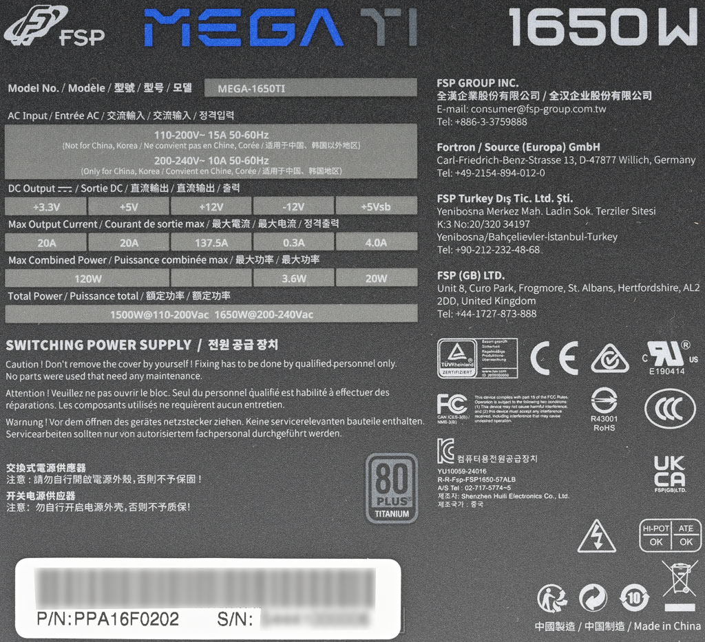 ▼電源背面標籤有商標、名稱、輸出功率、型號、輸入電壓/電流/頻率、各組最大輸出電流/功率、總輸出功率、廠商聯絡資訊、警告訊息、80PLUS鈦金認證、條碼、認證標誌。110V輸入電壓下最大輸出功率1500W