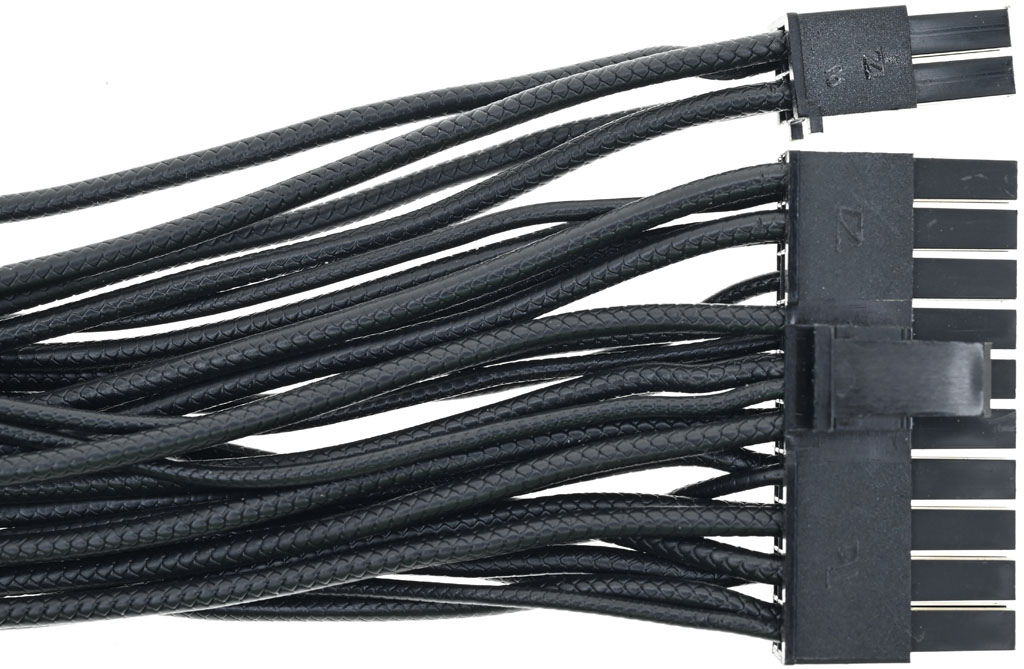 ○全模組化設計,採用壓紋線。提供1個ATX 20+4P、2個EPS 4+4P、2個12V-2×6、6個PCIE 6+2P、10個SATA(6個直角,4個直式)、6個直式大4P,未提供小4P接頭或轉接線