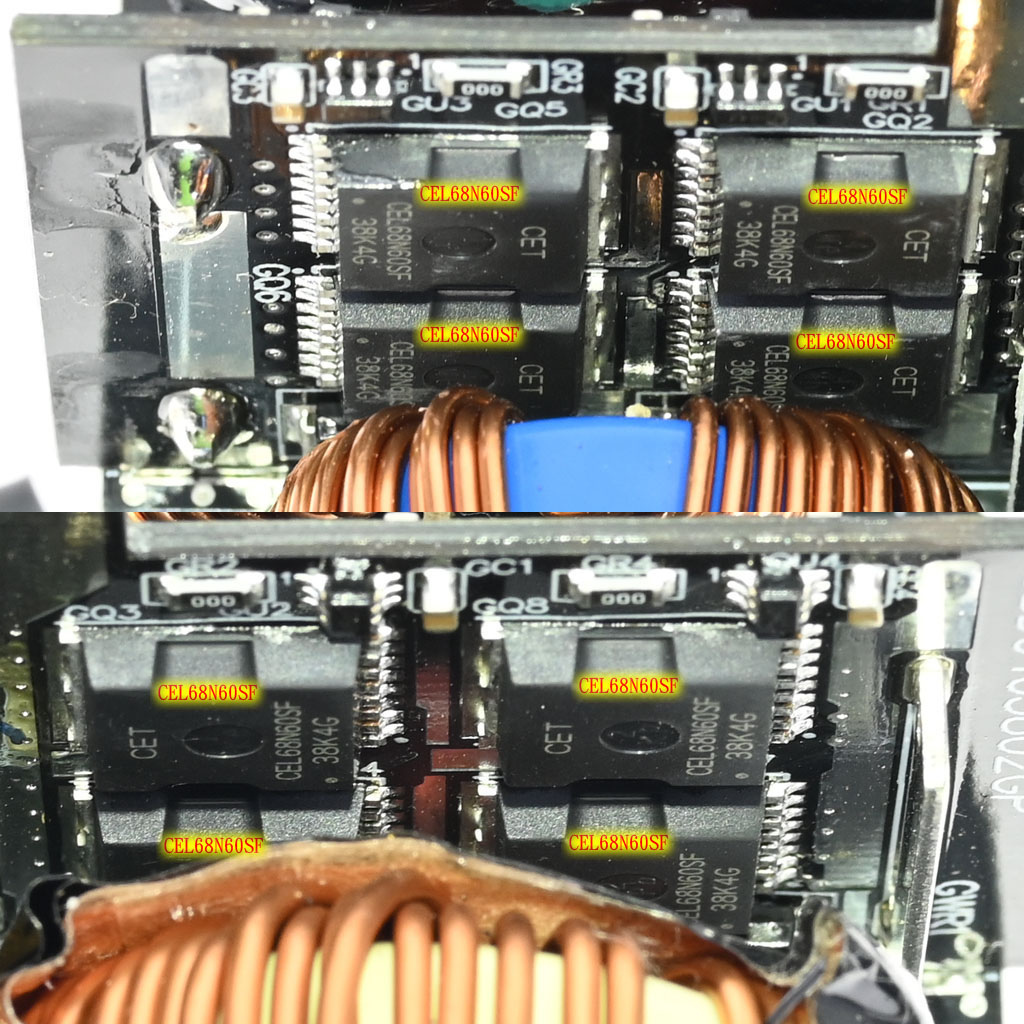○主動橋式整流MOSFET採用CET華瑞功率電子,APFC MOSFET/APFC二極體/3.3V&5V DC-DC MOSFET採用Infineon。主動橋式整流MOSFET採用TOLL封裝,APFC MOSFET採用全絕緣封裝,一次側MOSFET採用表面黏著封裝